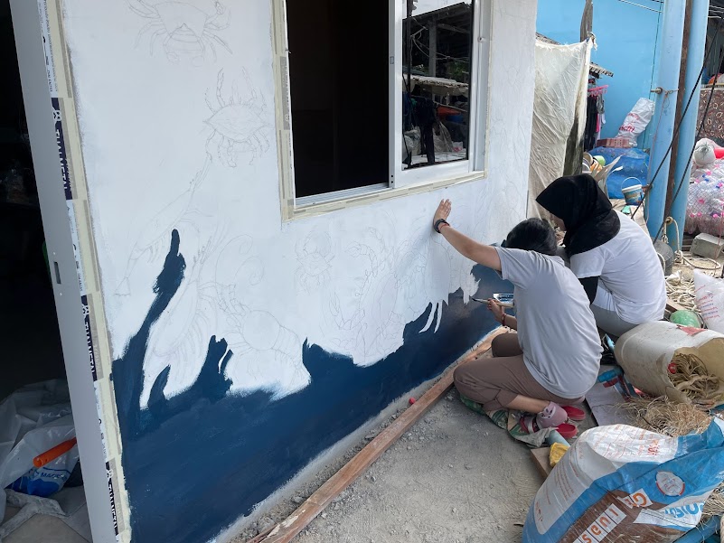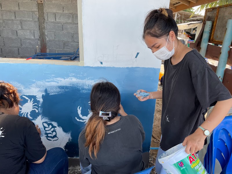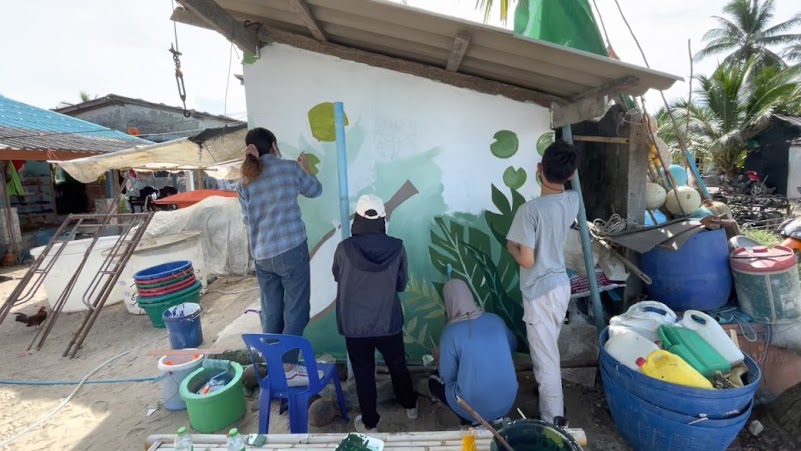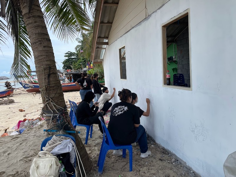 From the success of the Blue Crab Bank and the marine natural resource conservation of Ban Nong Hong community, Ko Petch Sub-district, Hua Sai District, Nakhon Si Thammarat Province. And the better community economy, this community has become an important learning centre where various agencies and other communities have come to study and visit the development of the community. The residents of Ban Nong Hong community, Ko Petch Sub-district, Hua Sai District, Nakhon Si Thammarat Province The community therefore had a meeting to discuss wanting to create a media to recognize the way of life of the community through drawing media. To show the environment and community way of life around the wall of the community paving bank building. Therefore coordinated with the School of Architecture and Design Walailak University Through the academic service centre of the University for the School of Architecture to bring students to the area to create media perception of community life through drawing media For the past actions, there are steps in the operation as follows.