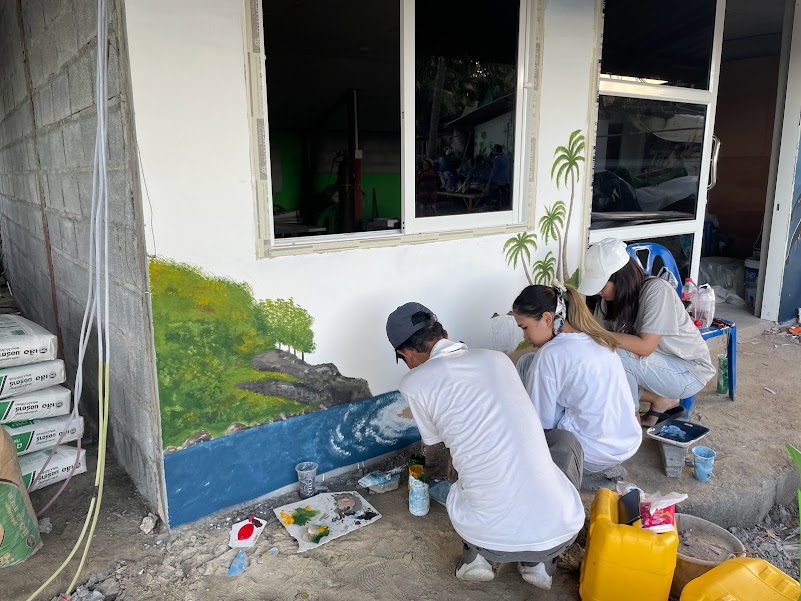 ขั้นที่ 2 นำนักศึกษาลงพื้นที่และเตรียมทำความสะอาดฝาผนังของธนาคารปูในบริเวณที่ต้องการสร้างสื่อด้วยภาพวาด
