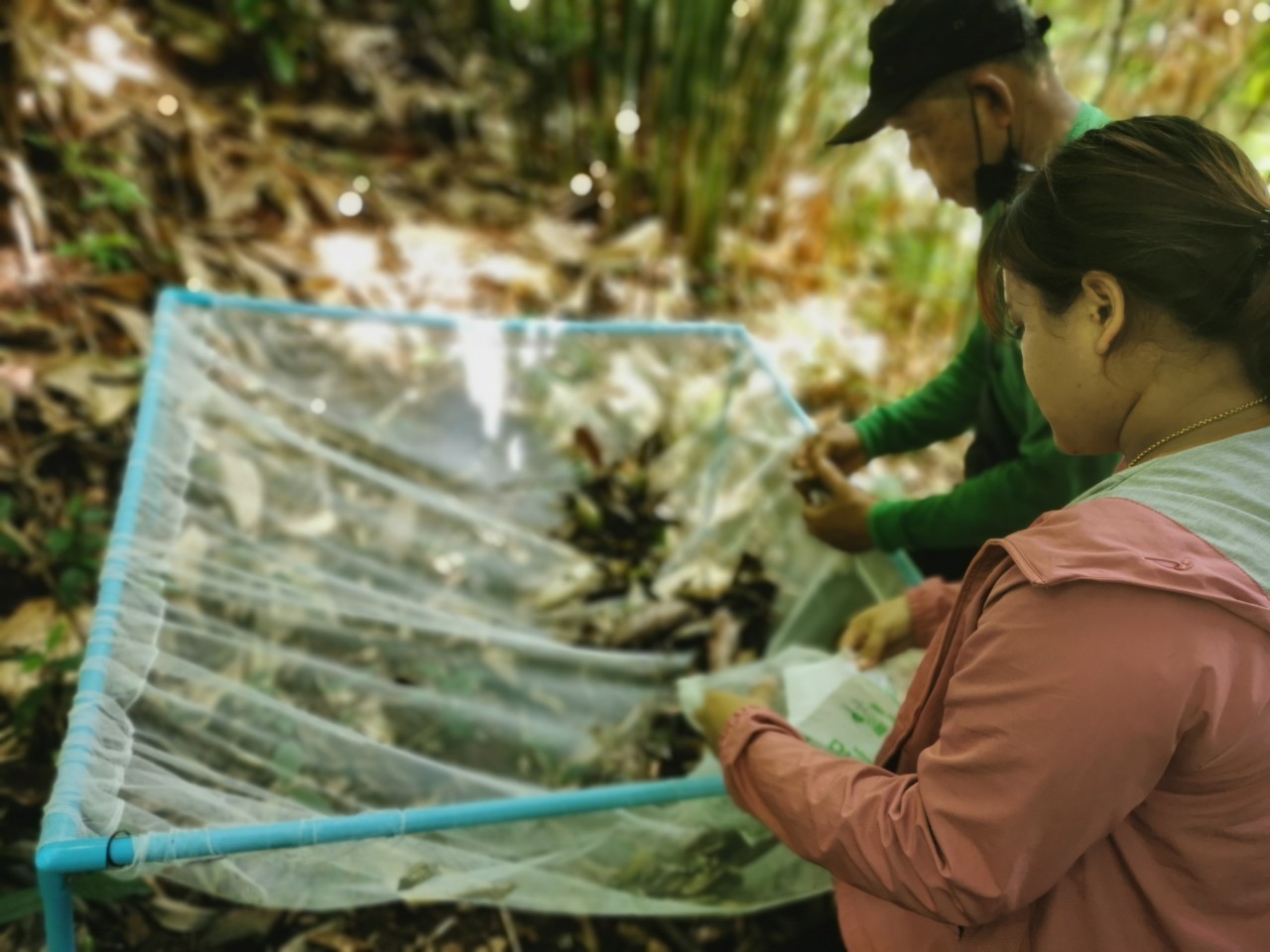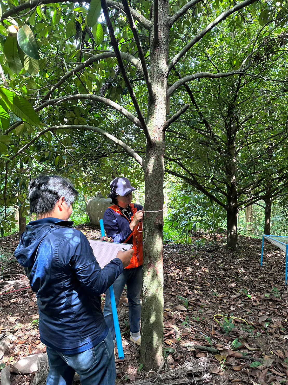 นักวิจัยได้ดำเนินการโดยทำการจัดทำแบบสอบถามข้อมูลประวัติการเพาะปลูกพืช เช่น การใช้ ปุ๋ย และ/หรือ สารปรับปรุงดินจากเกษตรกรในพื้นที่ศึกษา ลำดับต่อไปคือการสุ่มตัวอย่างแบบแบ่งชั้นภูมิ (stratified random sampling) และทำการประเมินการกักเก็บคาร์บอนของพื้นที่และการปลดปล่อยก๊าซเรือนกระจกจากการใช้ปุ๋ยและการปรับปรุงดิน วางแปลงเก็บตัวอย่างต้นจันทน์เทศเพื่อประเมินการกักเก็บคาร์บอนจากมวลชีวภาพพืช เก็บตัวอย่างเนื้อไม้ และราก ส่งตรวจหาสัดส่วนคาร์บอนในเนื้อไม้ (มวลชีวภาพใต้พื้นดิน) คำนวณมวลชีวภาพเหนือพื้นดินโดยเลือกสมการแอลโลเมตริก (Allometric equation) ที่เหมาะสมกับพื้นที่ เก็บตัวอย่างเศษซากใบไม้และกิ่งบริเวณสวนจันทน์เทศด้วยตาข่าย (การกักเก็บคาร์บอนของไม้ตายและเศษซากพืช) โดยใช้สมการแอลโลเมตรีซึ่งมวลชีวภาพของต้นไม้ ประกอบด้วยมวลชีวภาพเหนือพื้นดิน (Aboveground Biomass; ABG) และมวลชีวภาพใต้ดิน (Belowground Biomass; BLG) ขนาดแปลงตัวอย่างที่องค์การบริหารการจัดการก๊าซเรือนกระจกแนะนำคือ แปลงสี่เหลี่ยมจตุรัสขนาด 40 x 40 เมตร (ขนาด 1 ไร่) จดบันทึกต้นไม้ที่มีขนาดเส้นผ่านศูนย์กลางที่ระดับความสูง 1.30 เมตร และความสูงทั้งหมดของต้นไม้ในพื้นที่แปลงตัวอย่าง ในการศึกษาครั้งนี้เลือกสมการมวลชีวภาพของป่าดิบชื้นและป่าดิบแล้งในประเทศไทยเป็นแปลงเก็บตัวอย่างชั่วคราว โดยใช้ตาข่ายเก็บตัวอย่างมวลชีวภาพเหนือพื้นดินของต้นไม้ ได้แก่ ทุกส่วนของต้นไม้ที่อยู่เหนือพื้นดิน เช่น ลำต้น กิ่ง ใบ ดอก และผล รวมทั้งพืชพรรณอื่นๆ โดยกำหนดเก็บตัวอย่างมวลชีวภาพพืชตามช่วงอายุของต้นจันทน์เทศ แบ่งเป็น 3 ช่วงอายุ ได้แก่ ช่วงอายุต่ำกว่า 20 ปี, 20-40 ปี, และ 60 ปีขึ้นไป รวม 9 ตัวอย่าง เก็บข้อมูล 3 ครั้ง (เก็บเดือนละ 1 ครั้ง ตั้งแต่เดือน มี.ค., เม.ย., และ พ.ค.) หลังจากนั้นนักวิจัยได้เก็บตัวอย่างดินเพื่อหาปริมาณคาร์บอนที่กักเก็บในดิน (อินทรียวัตถุในดิน : soil organic matter) และวิเคราะห์ข้อมูล โดยการคำนวณมวลชีวภาพเหนือพื้นดินโดยเลือกสมการแอลโลเมตริก (Allometric equation) คำนวณปริมาณมวลชีวภาพของส่วนใต้พื้นดิน และคำนวณปริมาณการกักเก็บคาร์บอนทั้งเหนือพื้นดินและใต้ดินแล้ว นำมาหาปริมาณการกักเก็บคาร์บอนของต้นไม้ในพื้นที่ โดยการศึกษานี้จะประเมินรายได้จากการชดเชยคาร์บอนตามวิธีการทำสัญญาของ California Carbon Market รวมกับ Chicago Climate Exchange (CCX) ในเฟสต่อไป และขั้นตอนสุดท้ายคือการประเมินมูลค่าการกักเก็บคาร์บอนในระบบนิเวศสวนจันทน์เทศ