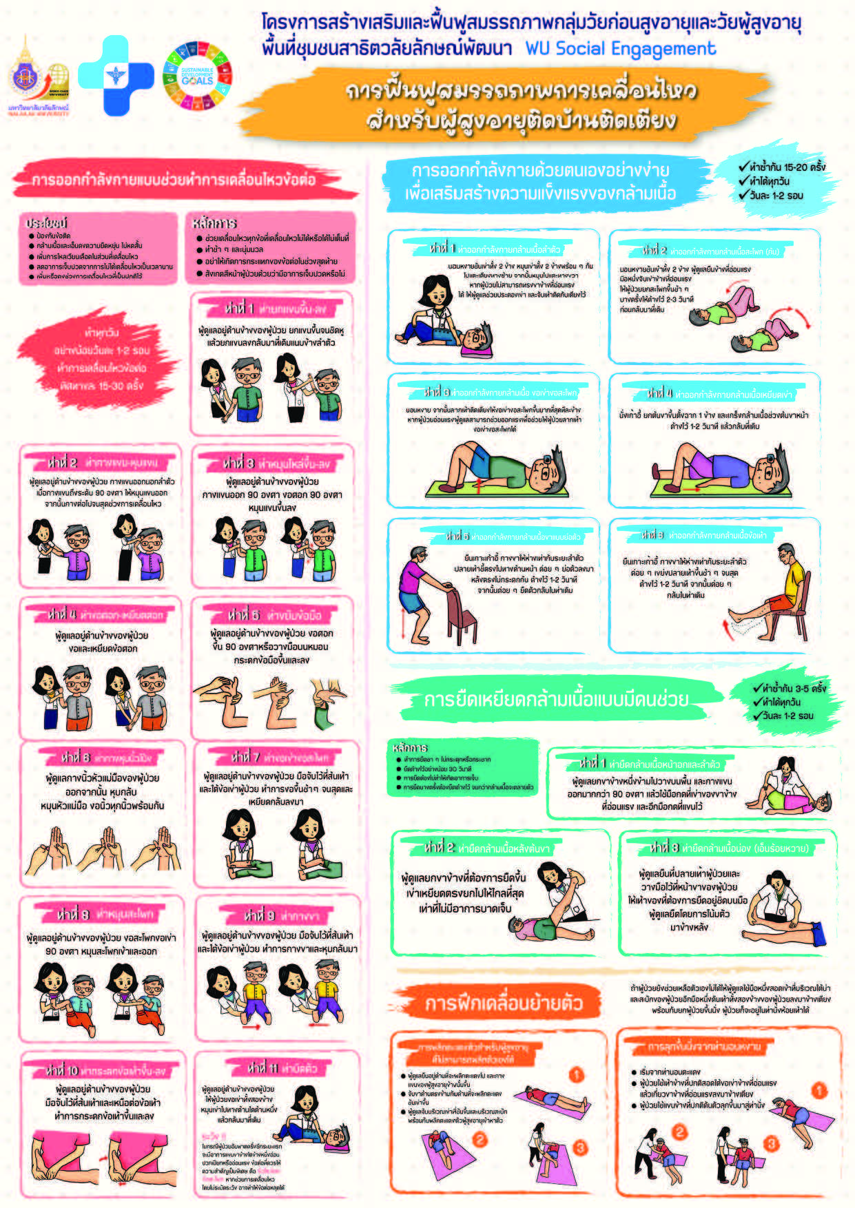The 4th consecutive year project titled “the Pre-elderly and Elderly Strengthen and Rehabilitation Project at Satit Walailak Pattana Community” of the School of Allied Health Sciences, Walailak University aims to provide patient care services covering subacute stage patients and a health system database preparation (eHealth) to be a patient database that is easy to access by service providers, both subdistrict health promotion hospital and host, and easy to forward information quickly by organizing outreach activities to enhance patient care and rehabilitation skills for subdistrict health promotion hospital staff and village public health volunteer leaders. Moreover, there are Movement Rehabilitation Program for bedridden elderly people, which provide disease promotion and prevention services to pre-elderly people who are at risk of disease by organizing a program to care for patients with Non-Communicable Diseases (NCDs), and those who come to receive services who are foreign workers at the Subdistrict Health Promotion Hospital. This is linked to Sustainable Development Goal 3, ensuring healthy living, and promoting the well-being of everyone at every age. Also, it is in line with indicators of THE Impact Ranking Education, section 3.3.2, the university delivers health outreach programmes and projects in the community to promote health and well-being by using physical therapy to promote and prevent disease for local community members, the elderly, bedridden patients (disadvantaged people), and immigrants who come to receive treatment at the Subdistrict Health Promotion Hospital, and there is the integration of teaching, research, and academic services in the form of Social Engagement to be used in solving problems, developing communities, society, and teaching and learning of Basic Physical Therapy in Community course that students can practice in community areas by undertaking educational outreach activity, consistent with indicators 4.3.4 and 17.2.1. This project is a collaboration between at-risk groups and their families, health teams, and health network partners in disease management that leads to self-health care appropriately and sustainably.
