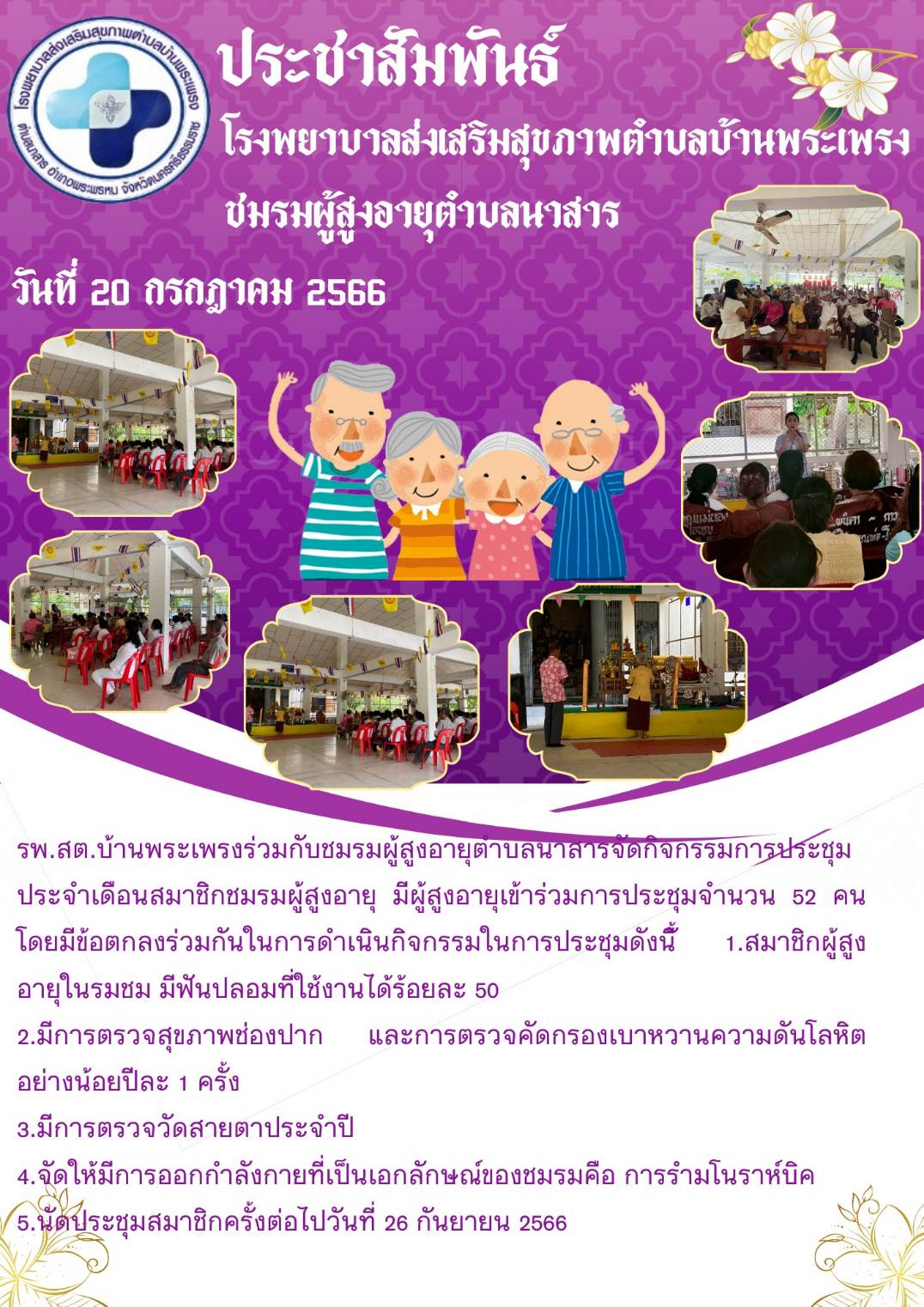 ปัจจุบันโรคไม่ติดต่อเรื้อรังเป็นปัญหาสาธารณสุขที่สำคัญของโลกและประเทศ ซึ่งมีแนวโน้มที่จะส่งผลกระทบมากขึ้นในอนาคต จากข้อมูลอัตราการป่วยด้วยโรคเรื้อรังในพื้นที่อำเภอพระพรหม ได้แก่ โรคความดันโลหิตสูง โรคเบาหวาน โรคหลอดเลือดสมอง จากสถานการณ์ดังกล่าว พบว่าผู้ป่วยโรคเรื้อรัง มีแนวโน้มที่เพิ่มขึ้นในทุกปี ทาง รพ.สต. พระเพรงได้กำหนดแนวทางการทำงานเพื่อจัดการโรคเรื้อรังในระบบบริการปฐมภูมิในการป้องกันความเสี่ยง ลดโรค ส่งเสริมศักยภาพในการดูแลตนเองเพื่อให้ประชาชนมีคุณภาพชีวิตที่ดี และส่งเสริมให้กลุ่มประชาชนที่ยังไม่ป่วย เพื่อให้มีการปรับพฤติกรรมการบริโภคและสภาพแวดล้อม เพื่อลดภาวะเสี่ยงในการดำเนินชีวิต และขับเคลื่อนกิจกรรมร่วมกับภาคีเครือข่ายทุกภาคส่วน เพื่อให้เกิดกระบวนการมีส่วนร่วมในโครงการปฏิบัติการจัดทำธรรมนูญสุขภาพรองรับสังคมสูงวัยในพื้นที่เขตสุขภาพที่ 11 ที่จะขับเคลื่อนธรรมนูญสุขภาพในการรองรับสังคมผู้สูงอายุของประชาชนในพื้นที่ตำบลนาสาร อำเภอพระพรหม เป็นพื้นที่นำร่องของเขตสุขภาพที่ 11 มีการดำเนินการ ปัญหาสาธารณสุขปัญหาสาธารณสุข 3 กิจกรรมหลัก คือ 1. กระบวนการยกร่างธรรมนูญสุขภาพผู้สูงอายุระดับตำบล 2. ประชาพิจารณ์ และ 3. ประกาศใช้ธรรมนูญสุขภาพระดับอำเภอ