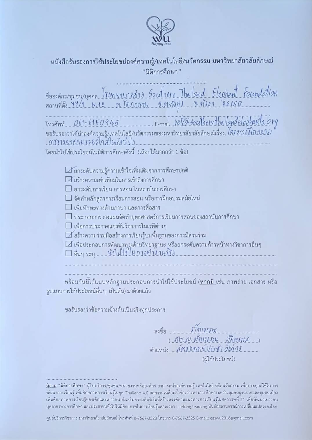 1. Coordinate with relevant government and private organizations involved in wildlife in Thailand, including university animal hospitals, private animal hospitals, the Department of National Parks, Wildlife, and Plant Conservation, and the Zoological Park Organization of Thailand.