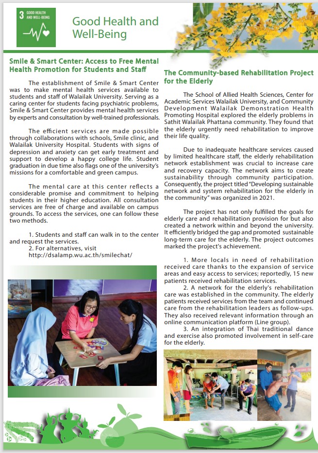 The University's contributions to the UN's SDGs and the Happy Tree Model in all areas, including stewardship, outreach, research, and teaching, are described in the WU SDG Report 2021–2022. As it satisfies indicator 17.3: Publication of SDG reports per SDG of the THE Impact Ranking Methodology 2023, the report is also utilized in submitting data for THE impact ranking. The Center for Academic Services and the School of Liberal Arts at Walailak University collaborated to effectively publish the report. To encourage the institution to be known globally as a conscientious steward of the world, all of the text was written in English.
