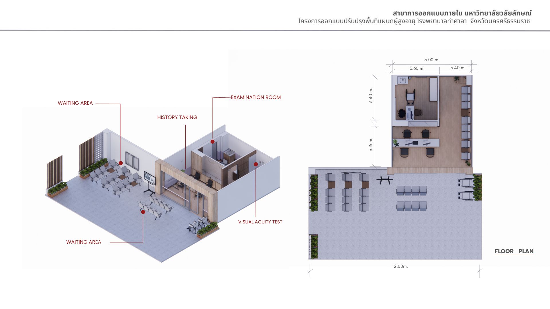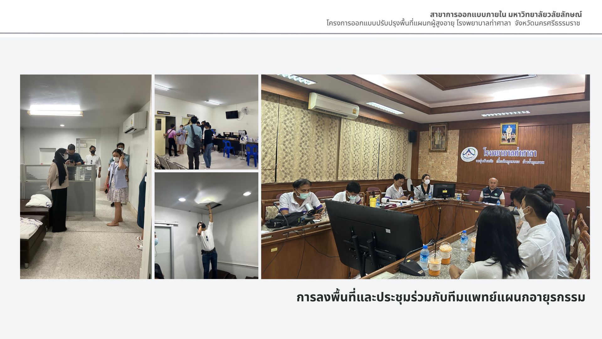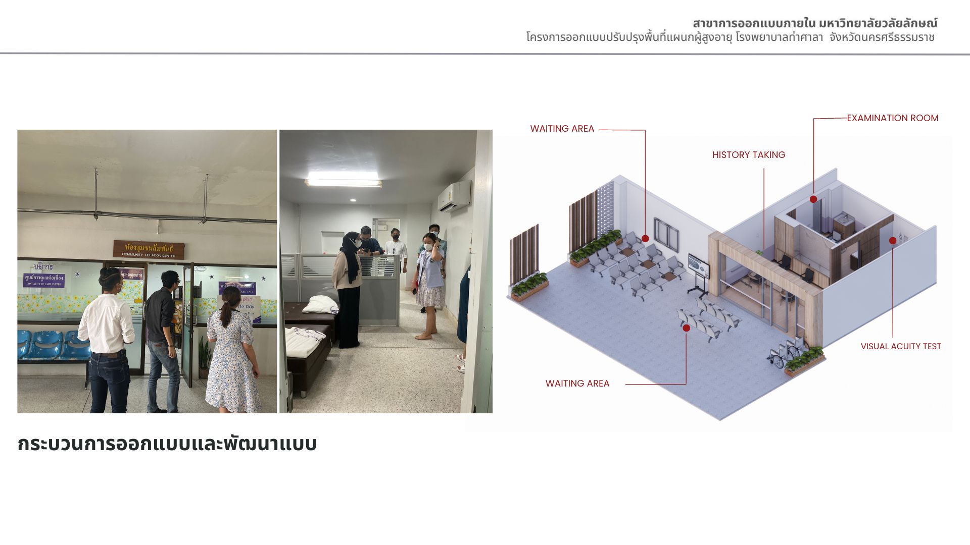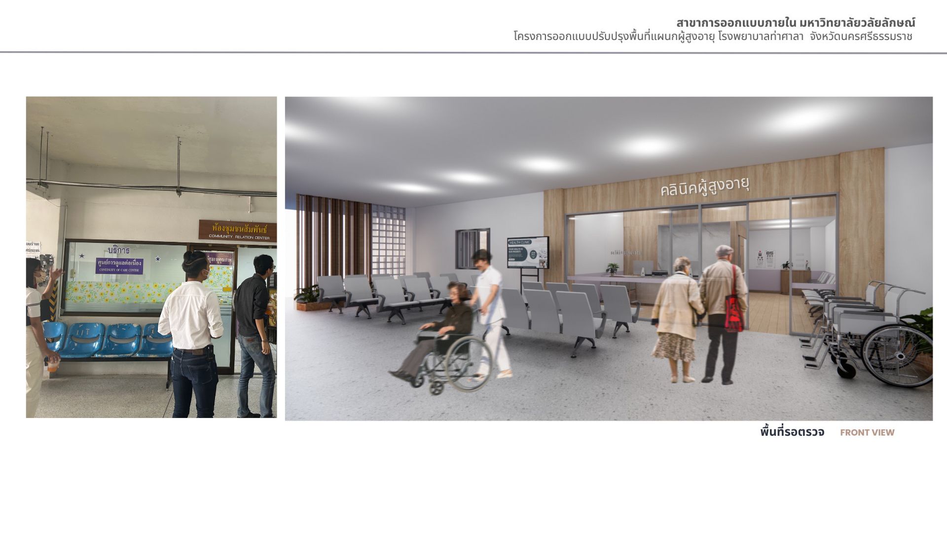 ภายใต้การร่วมมือระหว่างสาขาการออกแบบภายในและแผนกอายุรกรรมโรงพยาบาลท่าศาลาในการจัดหาแนวทางการออกแบบคลินิกผู้สูงอายุเพื่อตอบโจทย์การใช้งานหลักกลุ่มผู้สูงอายุและผู้ให้บริการแพทย์และพยาบาล โครงการได้ดำเนินการออกแบบและพัฒนาแบบจนได้แบบสถาปัตยกรรมภายในฉบับสมบูรณ์เพื่อใช้ในการก่อสร้างในกระบวนการถัดไป